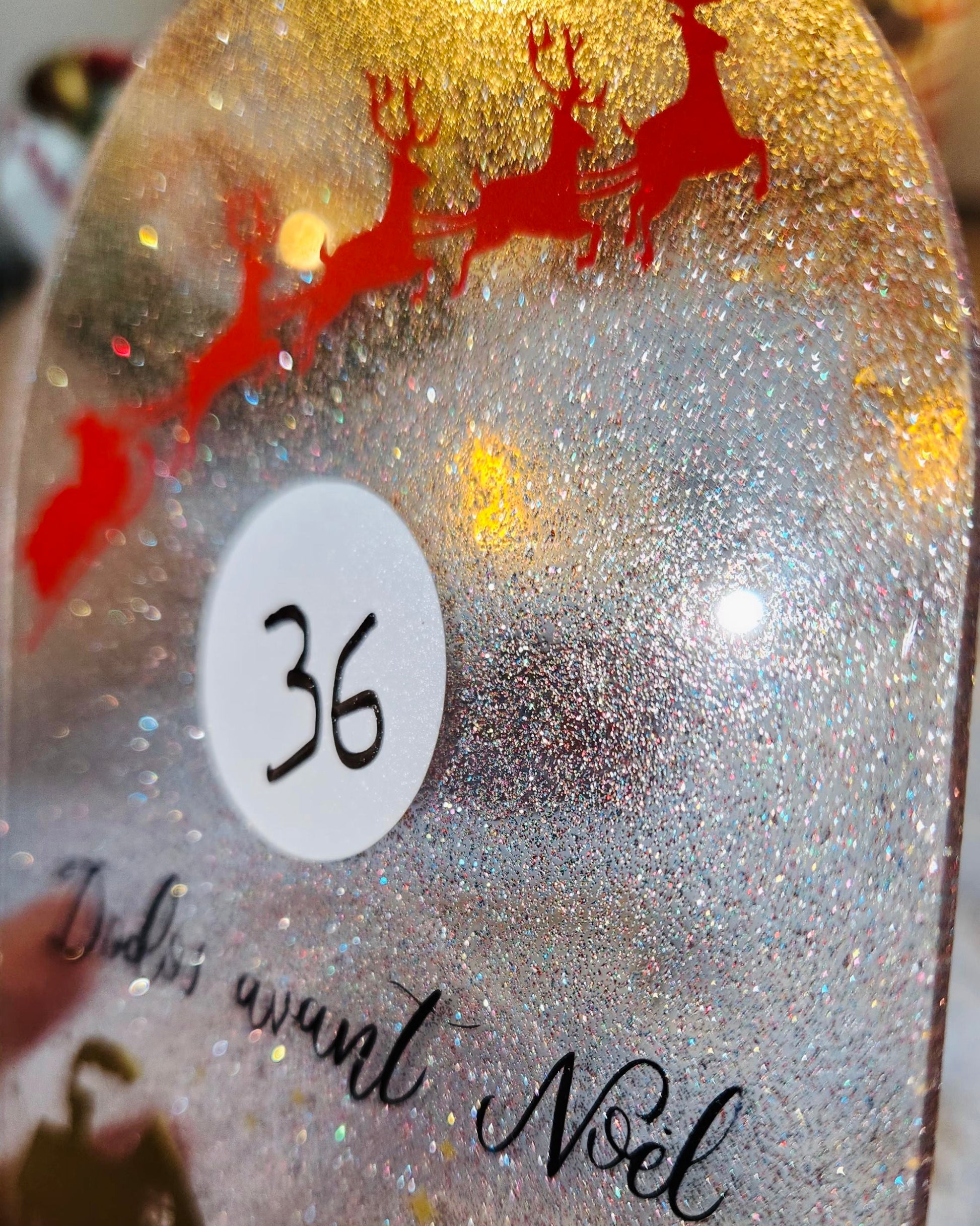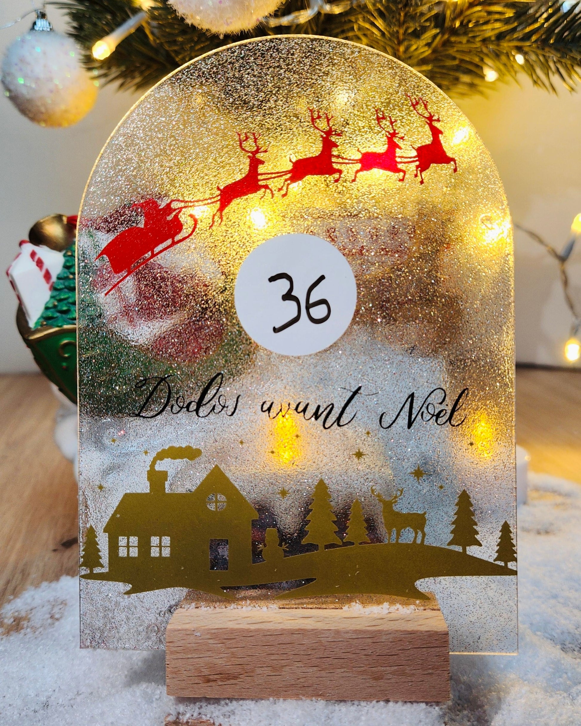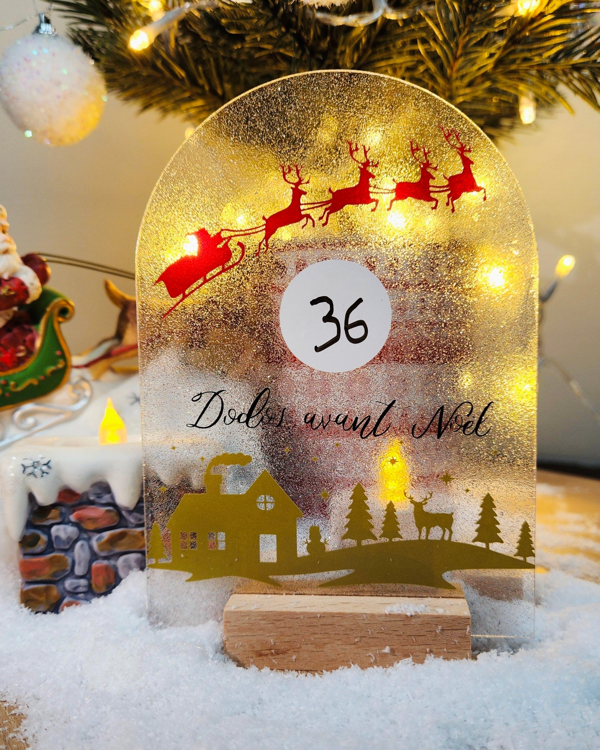 Noël arrive à grand pas, pourquoi pas faire patienter votre enfant de façon ludique avec cette jolie plaque en plexi «Dodos avant Noël» avec fond pailleté.