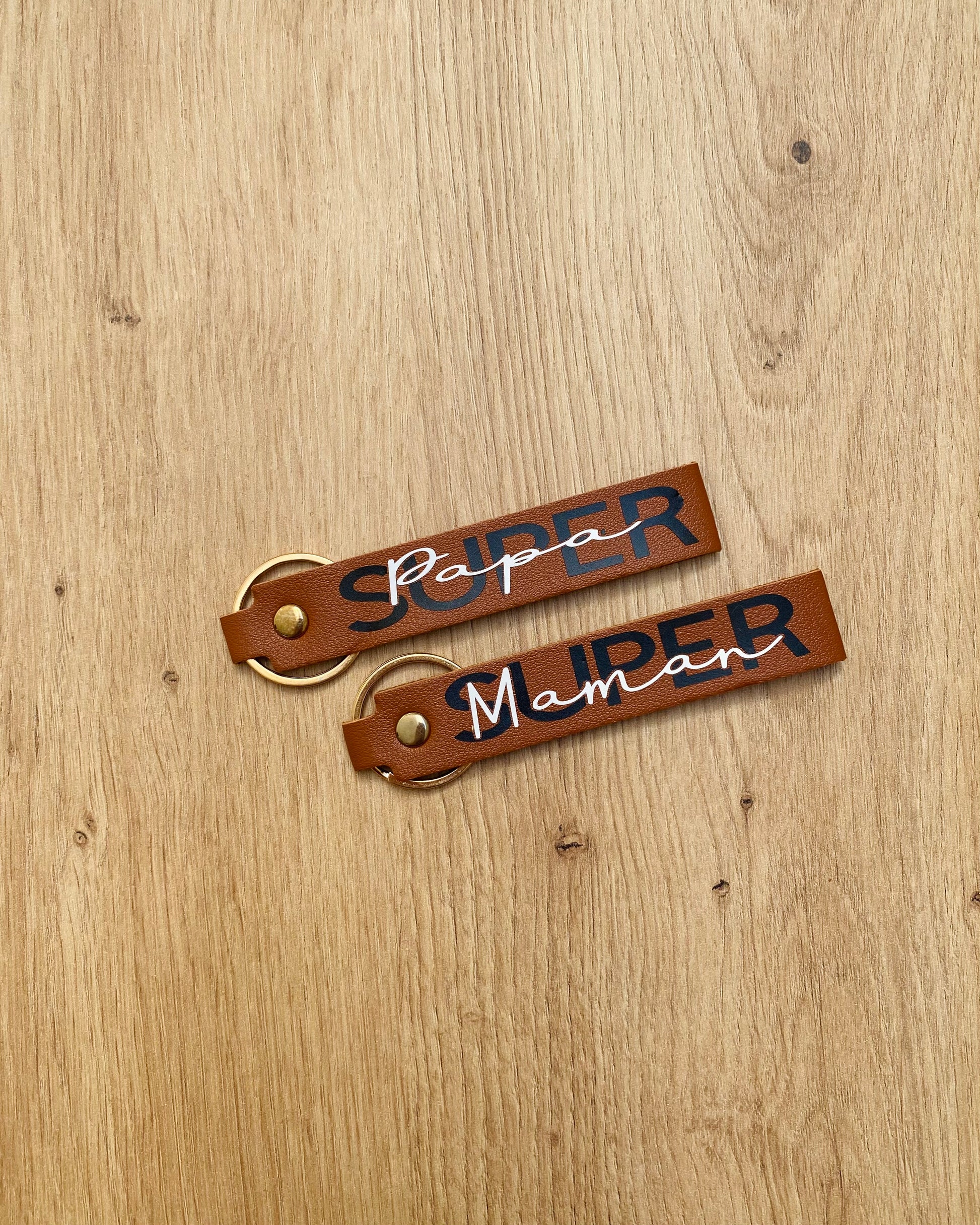 Porte clés en cuir avec anneaux couleur or et argent, personnalisable à l'infini, avec le texte de votre choix.